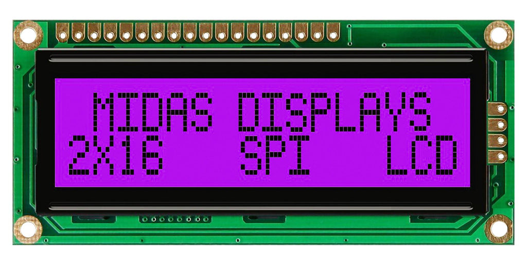 MIDAS - MD21605G6W1-FPTLRGBS - Alphanumeric LCD, 16 x 2, Black on RGB, 5V, SPI, English, Japanese, Transflective